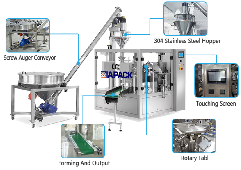 Maszyna ta może automatycznie wyjąć worek, otworzyć go, napełnić materiałem i zamknąć. Jest szeroko stosowana do pakowania różnych materiałów proszkowych.